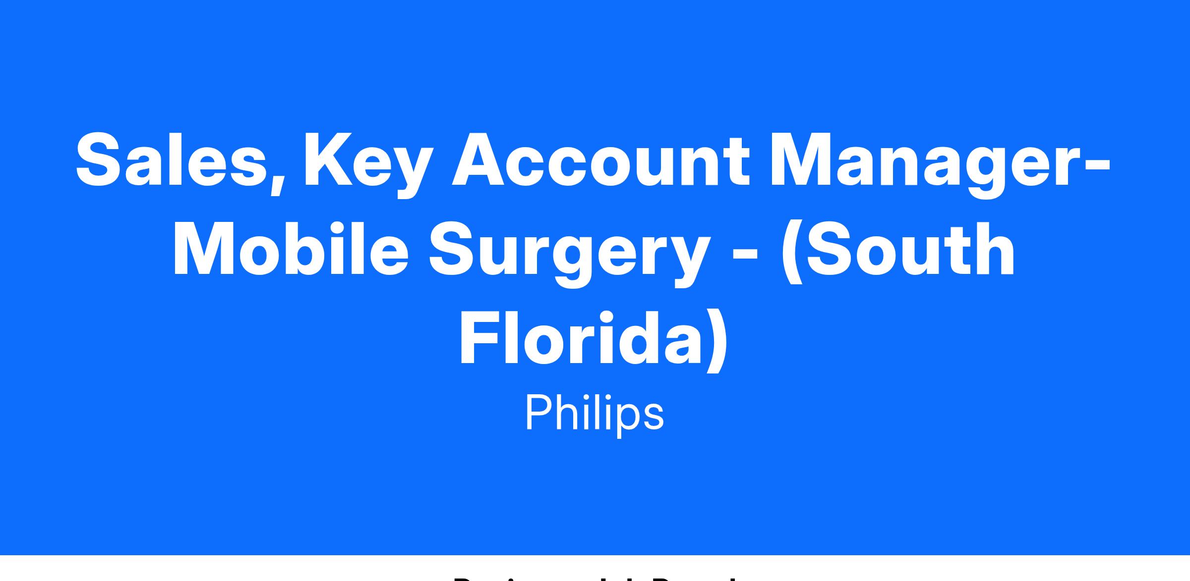 As the Mobile Surgery Key Account Manager (MoS KAM), you will be the primary point of contact for Mobile Surgery decision makers both inside and outside of the hospital. Primarily responsible for Mobile Surgery C-Arms and Services; identify, develop, and close MoS opportunities in Philips installed, competitive installed, and new construction labs and operating rooms.