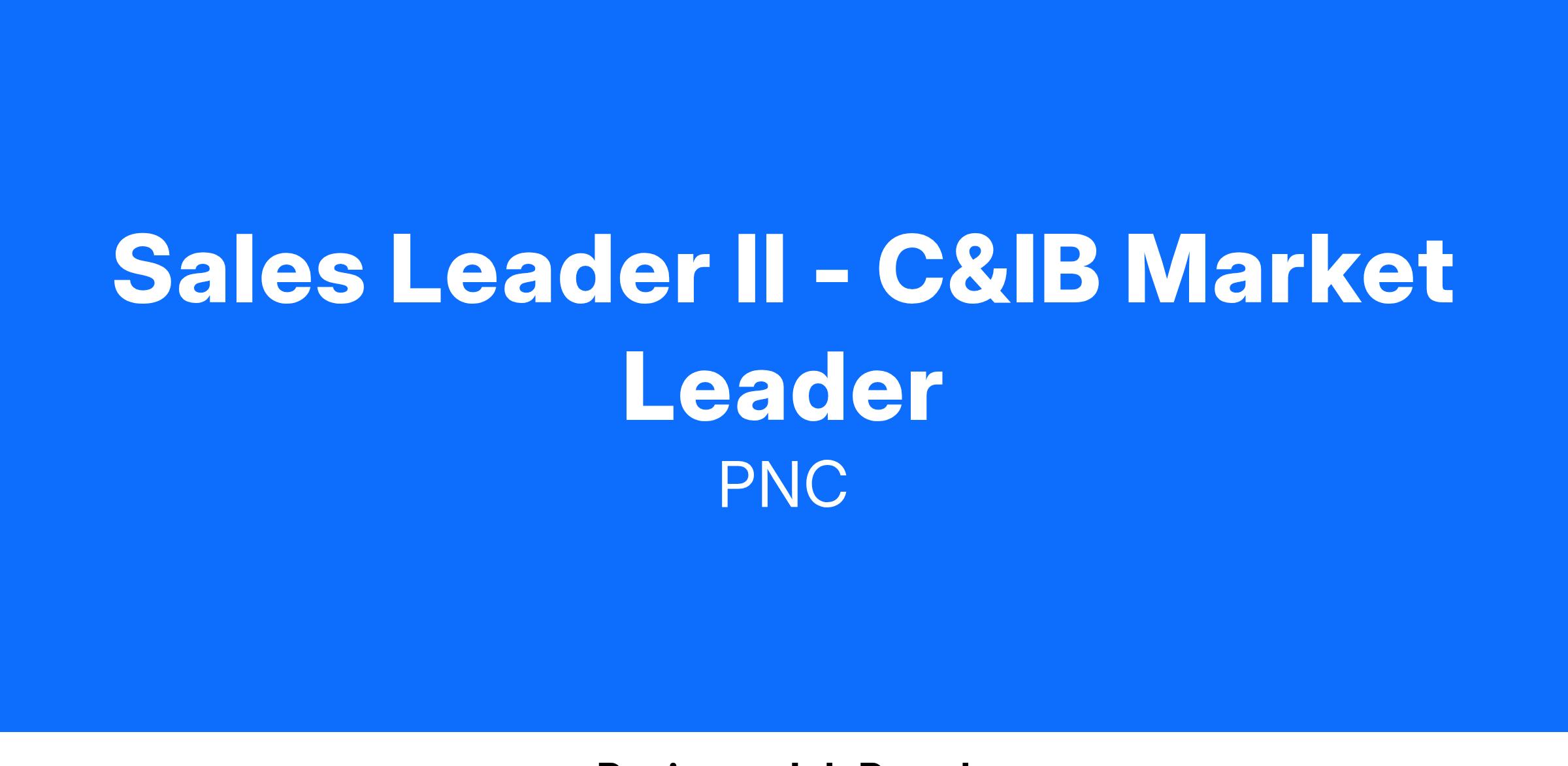 At PNC, our people are our greatest differentiator and competitive advantage in the markets we serve. We are all united in delivering the best experience for our customers. We work together each day to foster an inclusive workplace culture where all of our employees feel respected, valued and have an opportunity to contribute to the company’s success. As a(n) Sales Leader II - C&IB Market Leader within PNC's Sales Leader II - C&IB Market Leader organization, you will be based in Atlanta, GA.