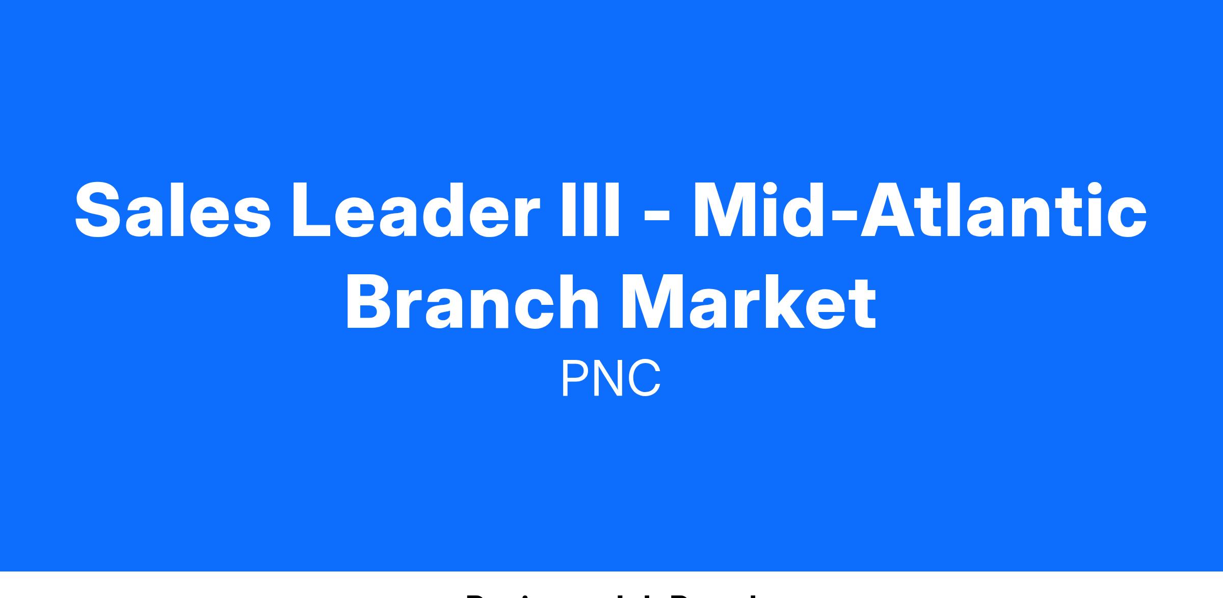 At PNC, our people are our greatest differentiator and competitive advantage in the markets we serve. We are all united in delivering the best experience for our customers. We work together each day to foster an inclusive workplace culture where all of our employees feel respected, valued and have an opportunity to contribute to the company’s success. As a Sales Leader III – Mid-Atlantic Branch Market within PNC's Retail Banking organization, you will be based in Baltimore, Maryland. Responsibilities require time in the office or in the field on a regular basis.
