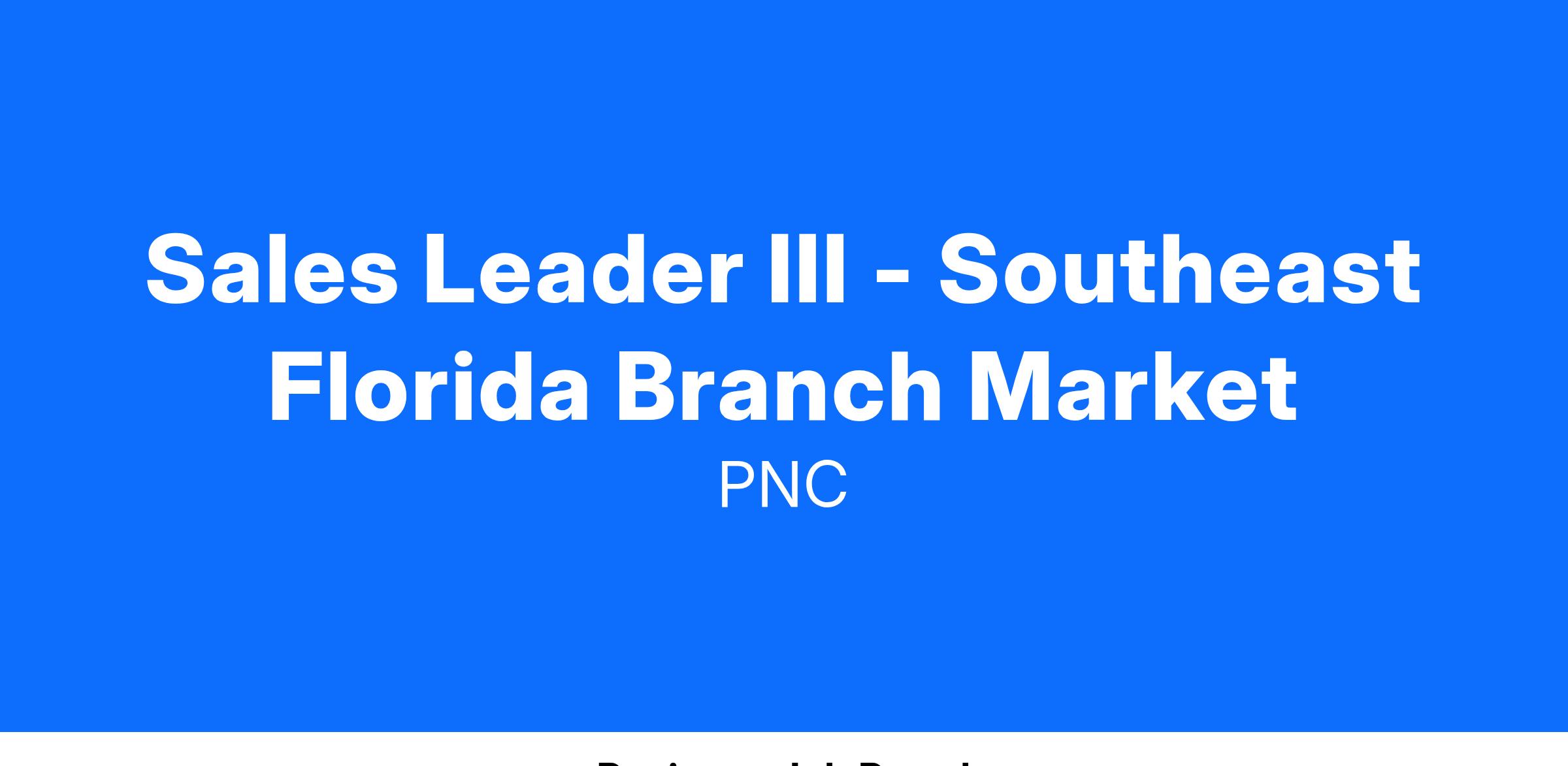 At PNC, our people are our greatest differentiator and competitive advantage in the markets we serve. We are all united in delivering the best experience for our customers. We work together each day to foster an inclusive workplace culture where all of our employees feel respected, valued and have an opportunity to contribute to the company’s success. As a Sales Leader III – Southeast Florida Branch Market within PNC's Retail Banking organization, you will be based in Miami, FL, Ft. Lauderdale, FL, Melbourne, FL or Palm Beach, FL. Responsibilities require time in the office or in the field on a regular basis. Some responsibilities may be performed remotely, at the manager’s discretion.