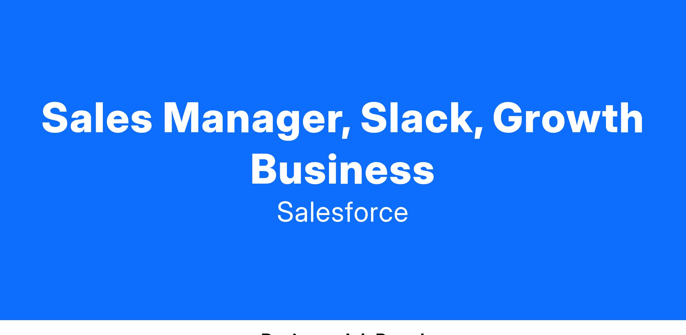 Slack is on a mission to make your working life simpler, more pleasant and more productive. Our culture is the north star that guides how we work together and with our customers. Are you looking to build something greater than yourself? Do you want to work alongside some of the most talented and dynamic people in the industry? If so, Slack at Salesforce just might be the place for you. We'll help you build your career in Sales while you collaborate with a diverse team of passionate, hardworking individuals.