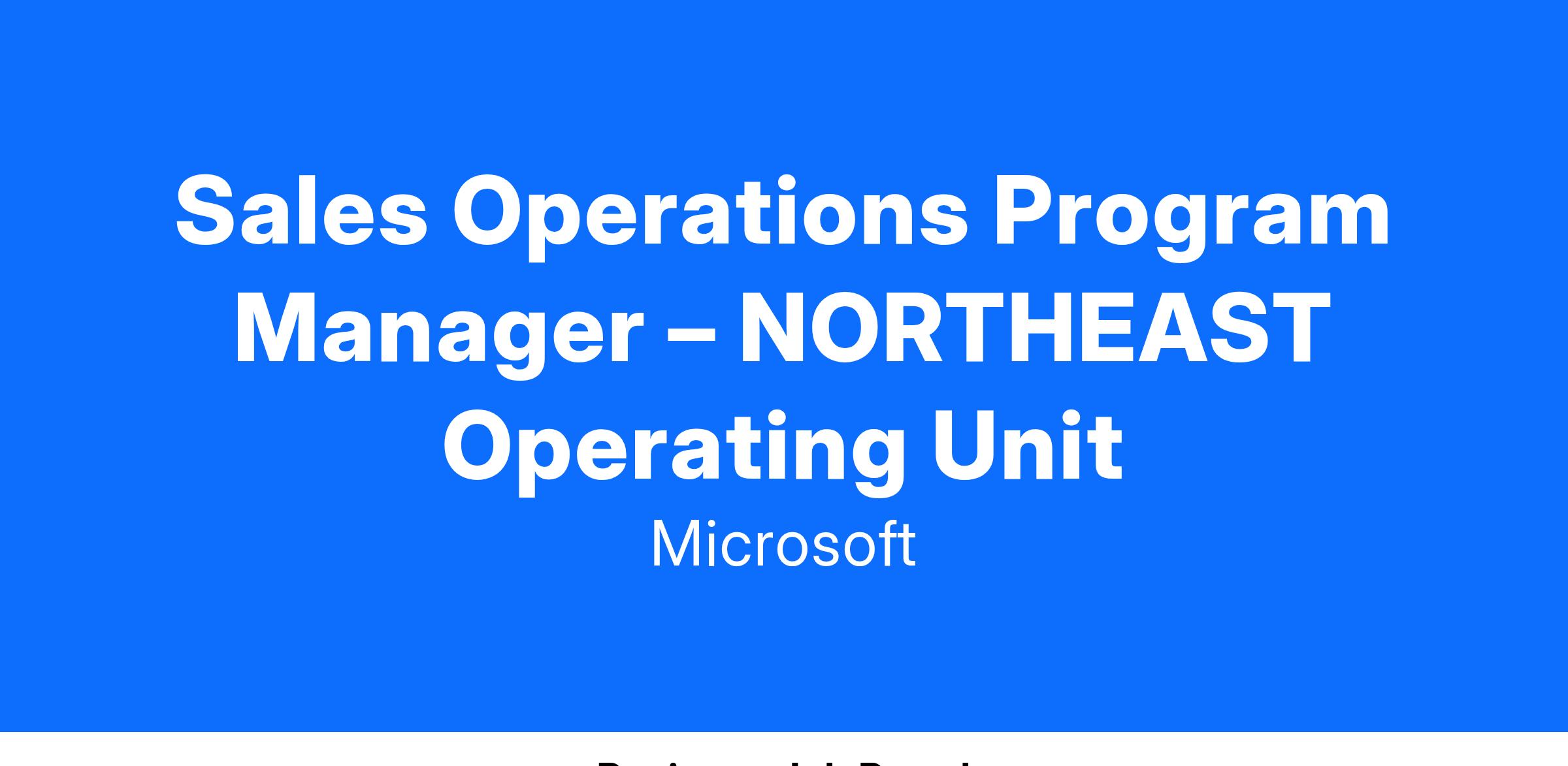 We are hiring a Sales Operations Program Manager (SOPM) to support and partner with the US NORTHEAST Operating Unit (OU) comprised of the Enterprise Customer Sales teams. This role reports to the Segment SOPM Manager and focuses on leading excellence in Sales Operations through orchestrating and improving processes across their operating unit within the Americas. One of the most important core priorities for the Sales Operations Program Manager is to enable end to end annual Quota distribution together with subsequent quarterly updates alongside with escalations on quota and compensation.