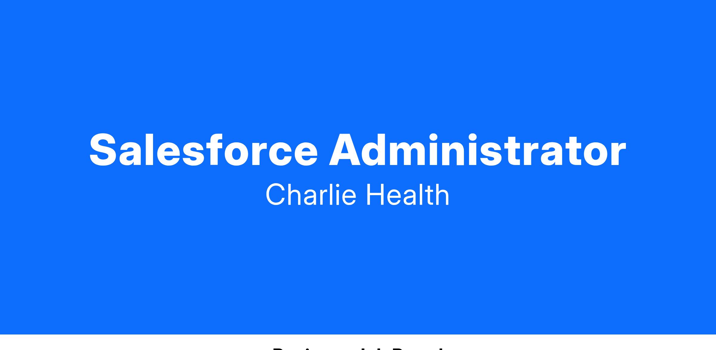 The Salesforce Administrator assists all teams across the organization with their Salesforce needs (Admissions, Clinical Outreach, Patient Finance, Compliance, etc.). Specifically, they ensure system integrity and efficiency, build the CRM infrastructure for Charlie Health, develop reporting to drive insights across the business, and create processes and onboarding documentation for users.