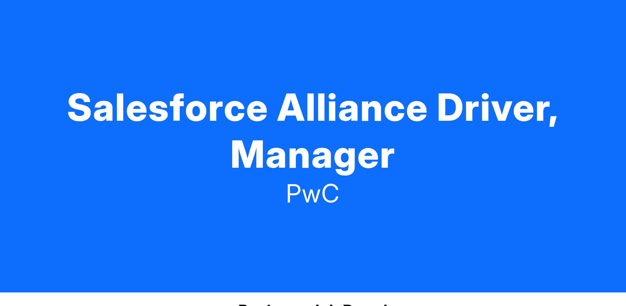 This Salesforce Alliance Manager will sit within the Alliance team and support the Salesforce Alliance in the TMT space. Focusing on the Salesforce Alliance overall strategy as we go to market, this role will drive PwC specific value propositions, strategic direction, account team interlock, and pipeline progression across the TMT sector.