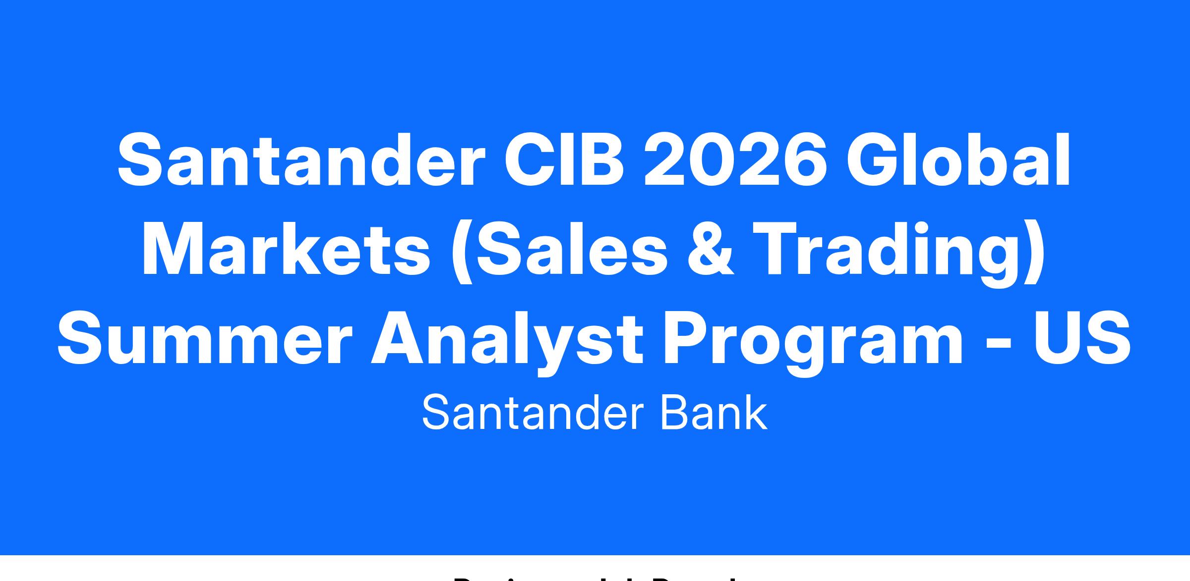 Santander US Corporate & Investment Banking (Santander CIB) is looking for the best talent to support our growth ambition and become future leaders through our 2026 Markets (Sales & Trading) Summer Analyst Program.