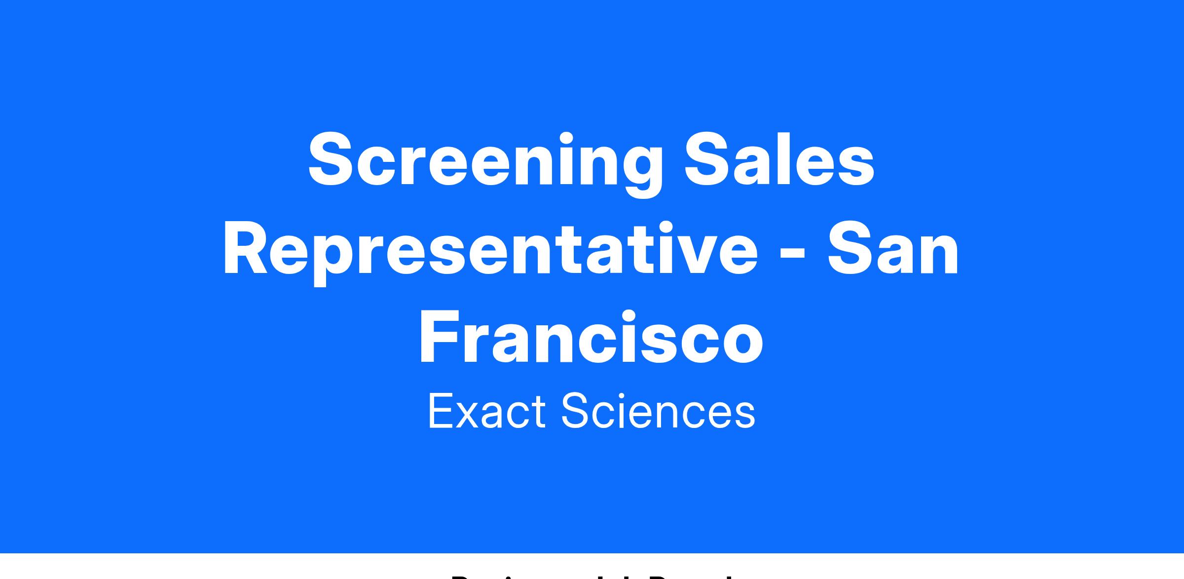 At Exact Sciences, we are cancer fighters. We are united by our mission to change lives by providing earlier, smarter answers. Through advances in cancer detection and treatment guidance, we will help eradicate the disease and the suffering it causes. A Screening Solutions Specialist (SSS) is a front-line position in the fight against cancer. The SSS will drive product growth of Cologuard in medical practices to meet sales goals within the assigned geography and deliver diagnostic solutions by establishing the importance of Colorectal Cancer (CRC) diseases and screening.