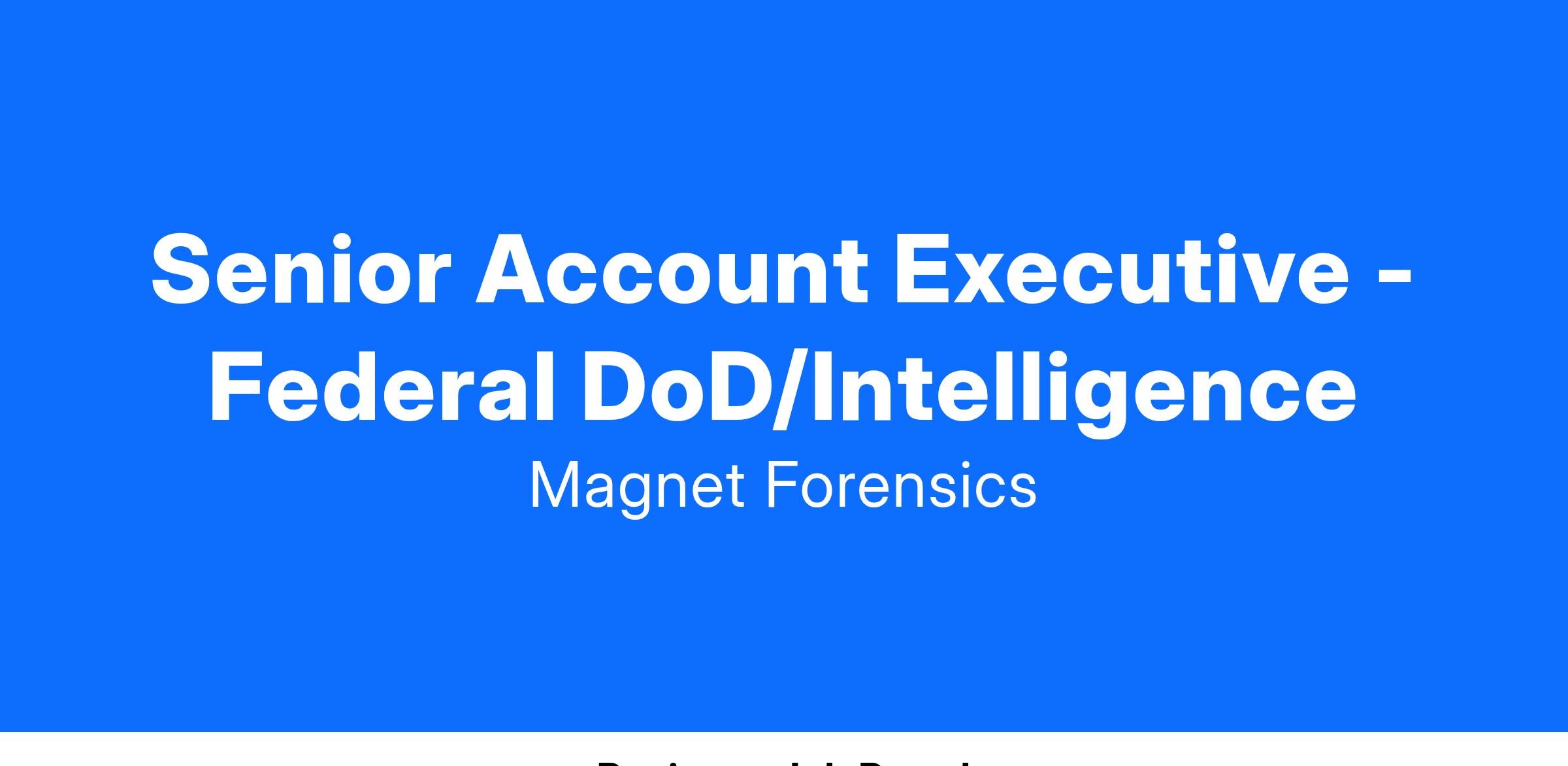 This Senior Account Executive position will be aligned to support US Federal DoD/Intelligence accounts and will be responsible for the generation of new sales opportunities utilizing Magnet Forensics’ portfolio of products, solutions and services.