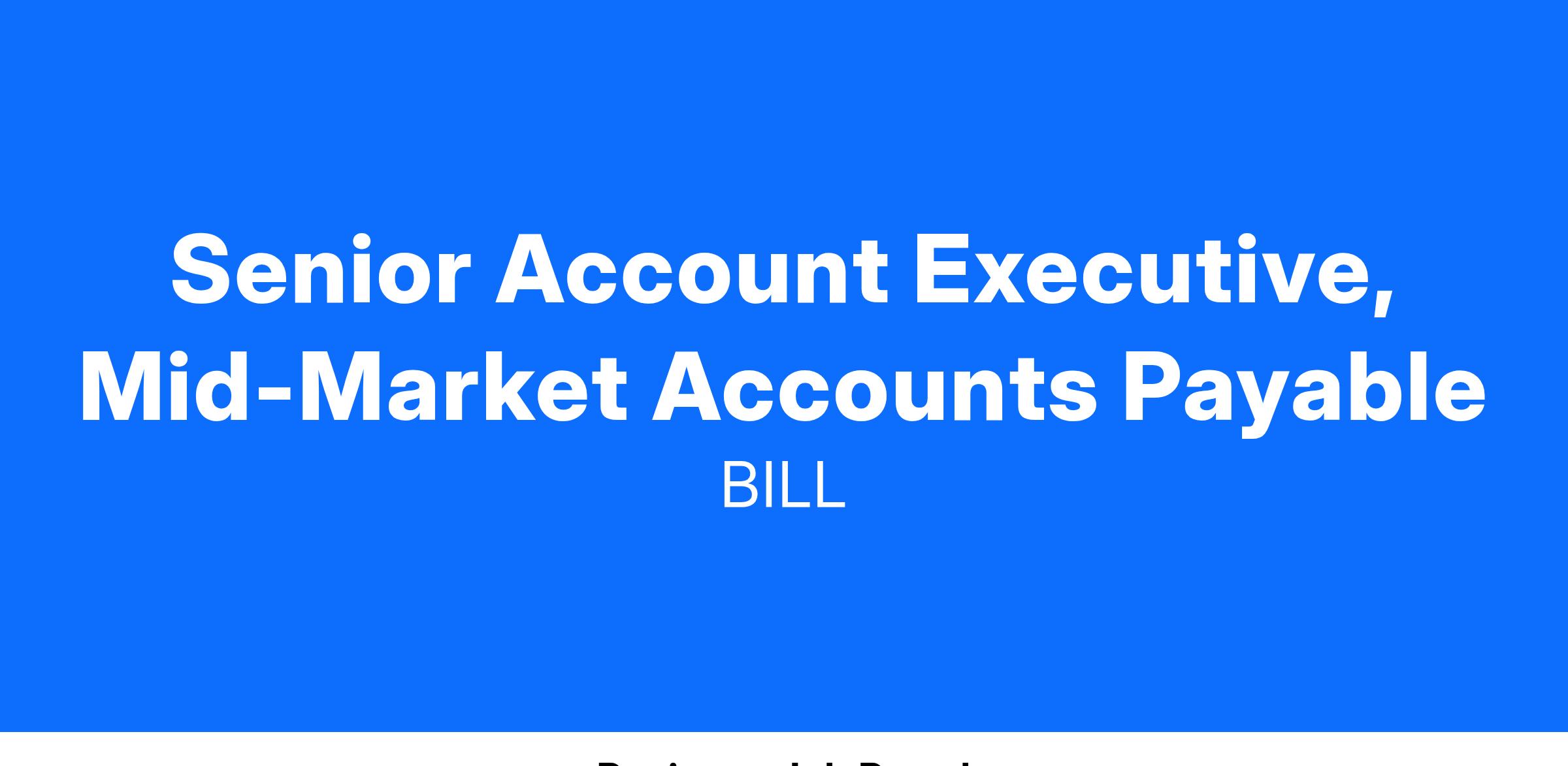 The Mid-Market Account Executive role at BILL provides an extremely unique opportunity -- we’re looking for talented and ambitious individuals who can both manage a high velocity sales cycle while also navigating a very strategic sales process with C-Level executives. You will be a member of the team responsible for 100% of your pipeline through a full sales cycle, including prospecting, disco, demo, contract signing. This critical role builds excellent relationships with our mid-market cross functional teams, such as Marketing, Operations, Enablement, and many more. You will provide prospects with secure, faster, simpler, and safer digital payment solutions for their A/P, A/R, Spend & Expense, and other cash-flow needs.It is an outstanding time to join the industry leader in a huge market opportunity.
