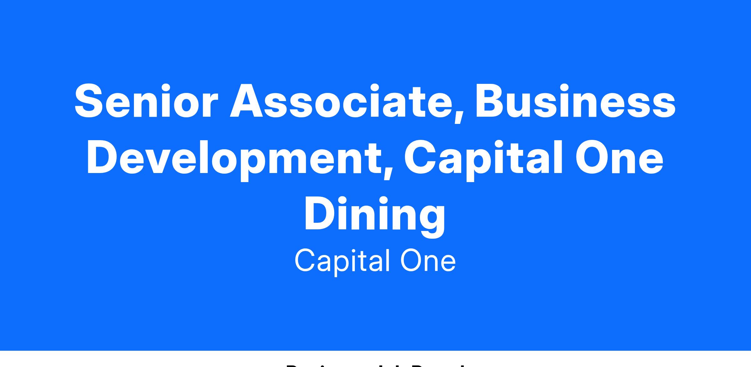 Capital One Dining is seeking a dynamic Senior Associate, Business Development, to support the growth and success of its exclusive dining program. Reporting to the Business Development Manager, this role is perfect for someone with a passion for the dining industry and a desire to make an impact on both the restaurant community and Capital One’s premium cardholder experience. The role is only open to candidates with prior experience in restaurants, premium events, or other relevant industry experience.