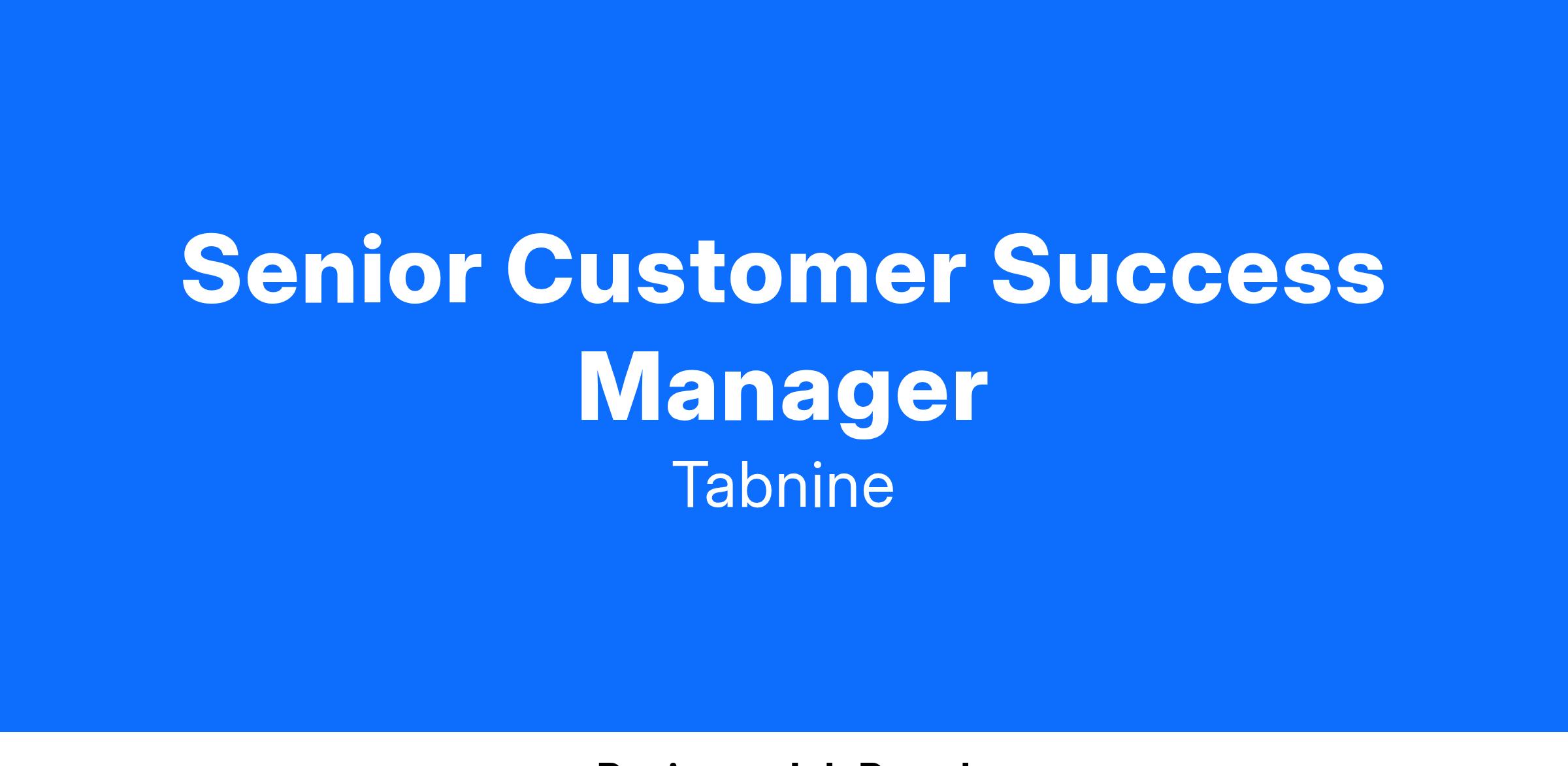 We are looking for a Senior Customer Success Manager with SDLC experience, ready to help drive our customer adoption, renewals and expansions for Enterprise customers, reporting to the Vice President of Customer Success. As the post-sales account owner working collaboratively with the Account Executive, your job will be to drive all the post sales activities and to ensure outstanding customer success measured by adoption, renewal and expansion. You will work with customers to understand their objectives and provide analytics on their Tabnine adoption, understand objections and craft a plan to unblock adoption and exceed customer expectations.