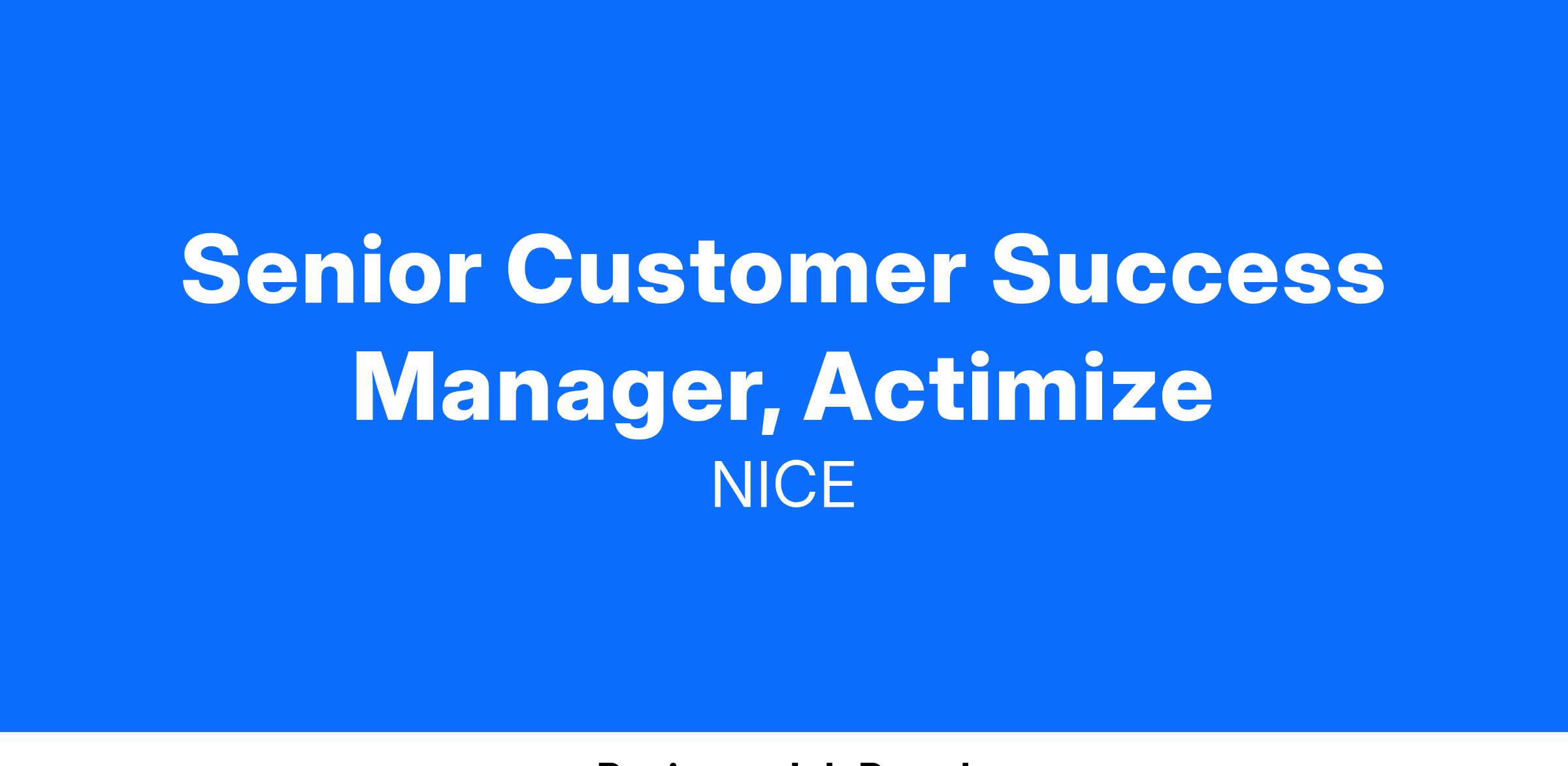 NICE Actimize is currently seeking an experienced, action-oriented, high energy Senior Customer Success Manager to manage the post-sales relationship for assigned strategic accounts, for the purpose of building customer loyalty and satisfaction, consistent with revenue retention and growth objectives.