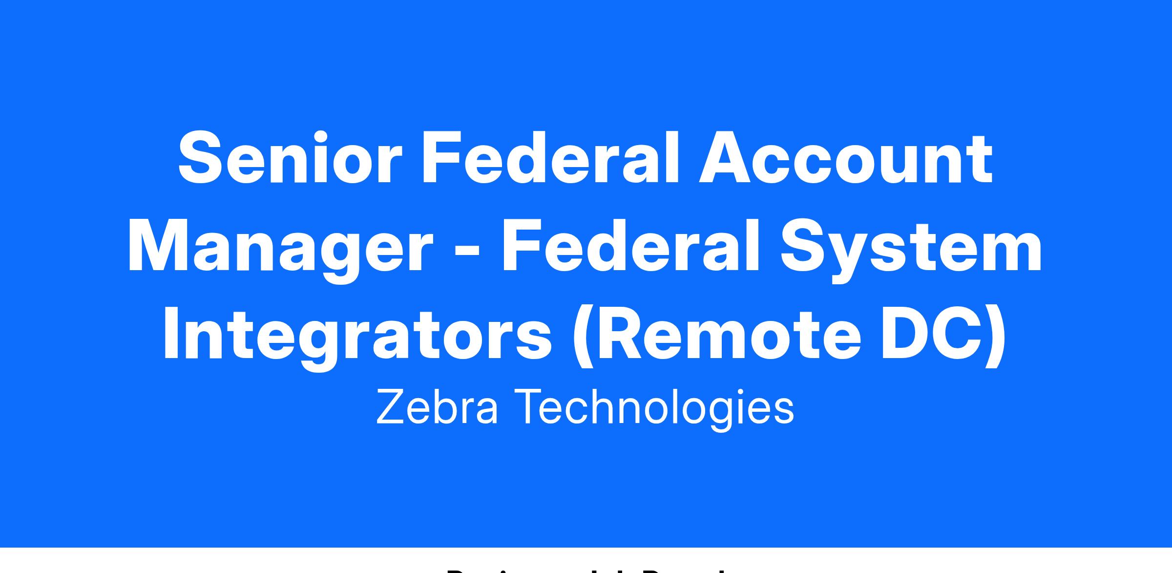 Takes ownership of new product, services, and/or solutions sales for assigned US Federal Government System Integrators. Develops and executes sales strategy for assigned Federal Government account(s) with manager’s input; develops strong relationships with key customer contacts and leverages to Zebra’s advantage; creates and delivers high impact sales presentations and capable of product training; often used for those with strong technical background but limited sales experience. Develops and executes sales strategies for new products, services and solutions with minimal input from manager for a higher level of financial responsibility; proactively sells solutions independently or in conjunction with Zebra's broader product portfolio. As required, leverages relationships with other business units and/or external partners to deliver solution; Develops strong relationships with key decision makers and influencers; Initiates and leads customer presentations and value proposition creation.