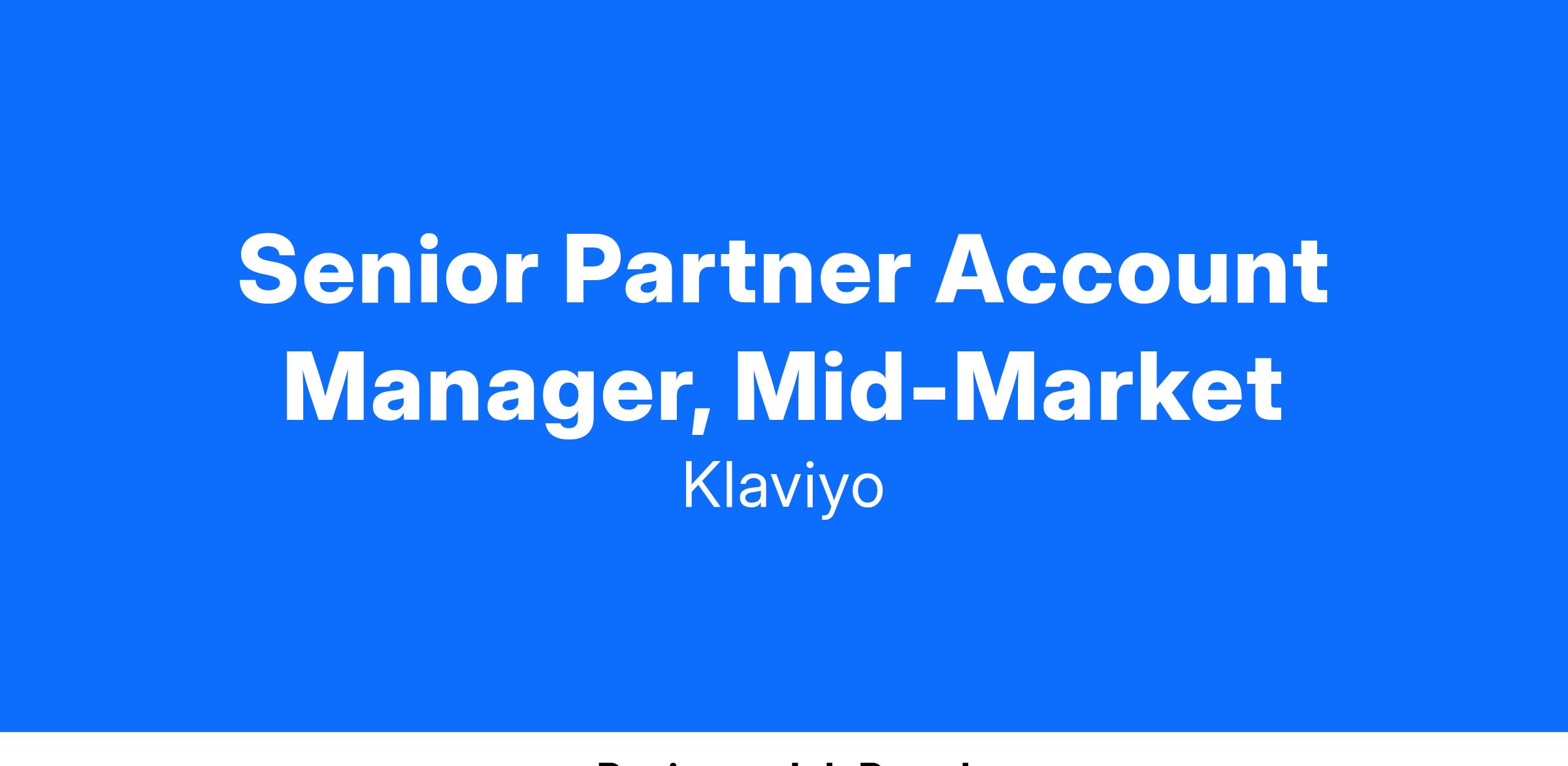 At Klaviyo, the partnerships team prides themselves on being marketing and product experts. As a Senior Partner Manager, you will be responsible for building a long term, deep, and mutually-beneficial relationship with Klaviyo’s marketing agency and systems integrator partners. You will leverage strong consultative skills to understand your partners’ business model and growth strategy so that you can identify ways Klaviyo can help them (and their clients) grow.