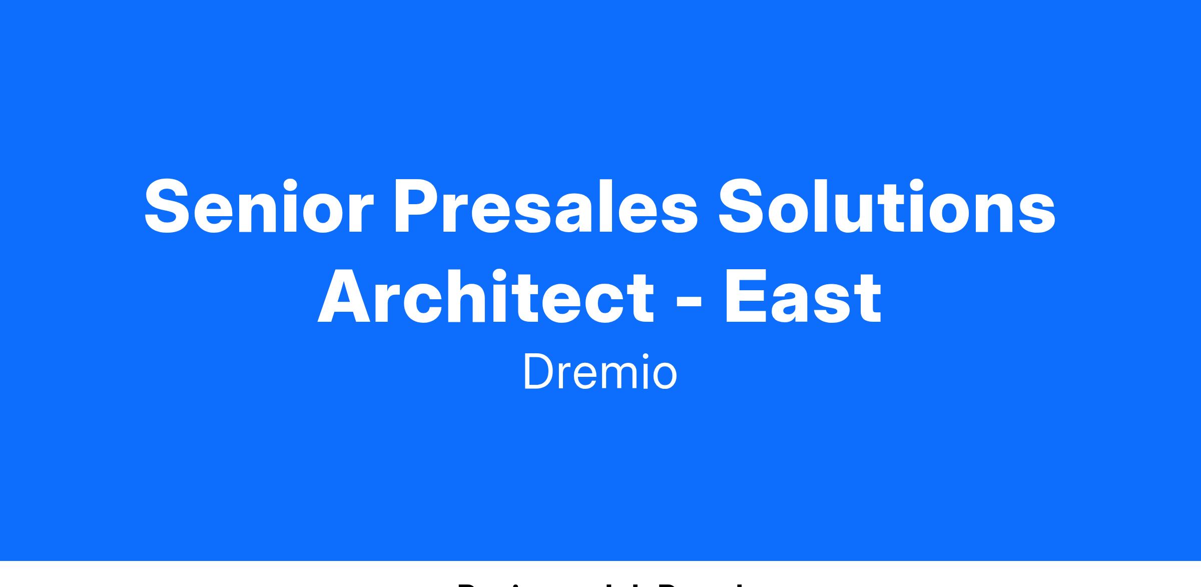 As a Presales Solutions Architect, you will work proactively with the technical community in the East region to innovate and develop technical strategies and solutions supporting a common outcome. Qualified candidates will demonstrate the capability to excel in a fast-paced environment, demonstrate deep knowledge of international operations and the unique nuances operating within various geographies. The Presales Solutions Architect must be passionate about Dremio’s mission, thrive in a dynamic environment, and be willing to jump in and get things done. The candidate is equally comfortable in both business and technical contexts, interacting both with executives and technology practitioners.
