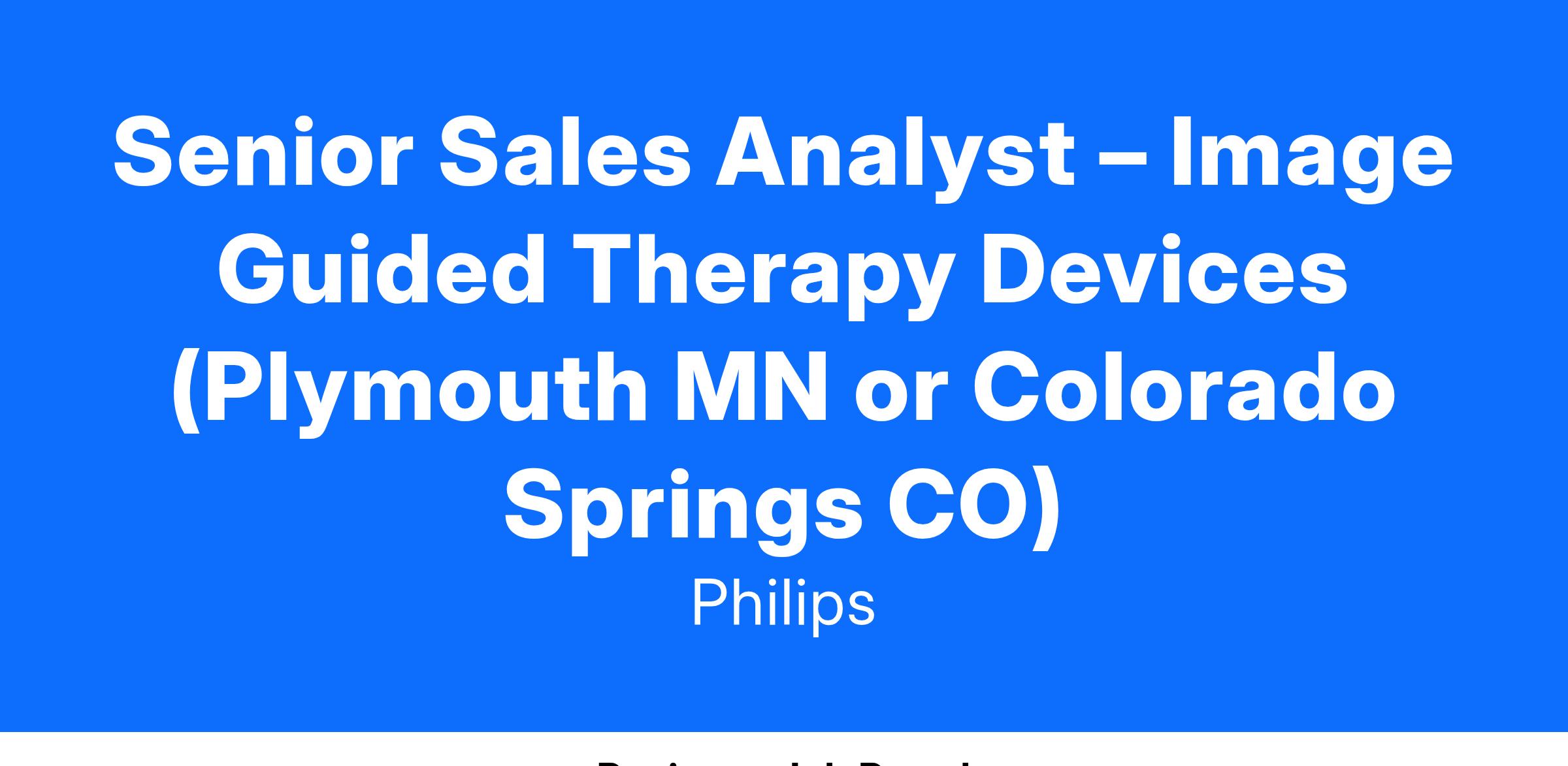 The Senior Sales Analyst is responsible for accelerating commercial performance by supporting the Philips Image Guided Therapy Devices team with funnel management, forecasting, performance reporting, and strategic insights and analytics. This role will be at the forefront of Image Guided Therapy – Devices (IGT-D) sales strategy, partnering with other analysts to develop cross-modality insights and strategies. Successful Analysts will combine industry expertise, strategic thinking, and analytical rigor to enable best in class sales execution.