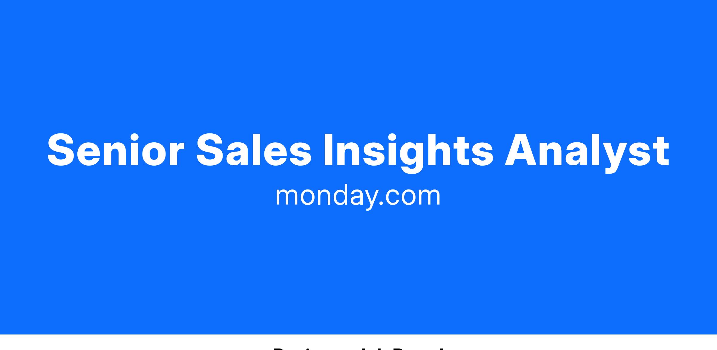 We are looking for a Senior Sales Insights Analyst to join the RevOps team, a leading team in the company, which supports hundreds of millions of dollars, leads strategic processes and serves as a compass for the revenue group (CRO). The role requires great storytelling skills, an eye for detail, great communication, and a keenness for problem-solving.