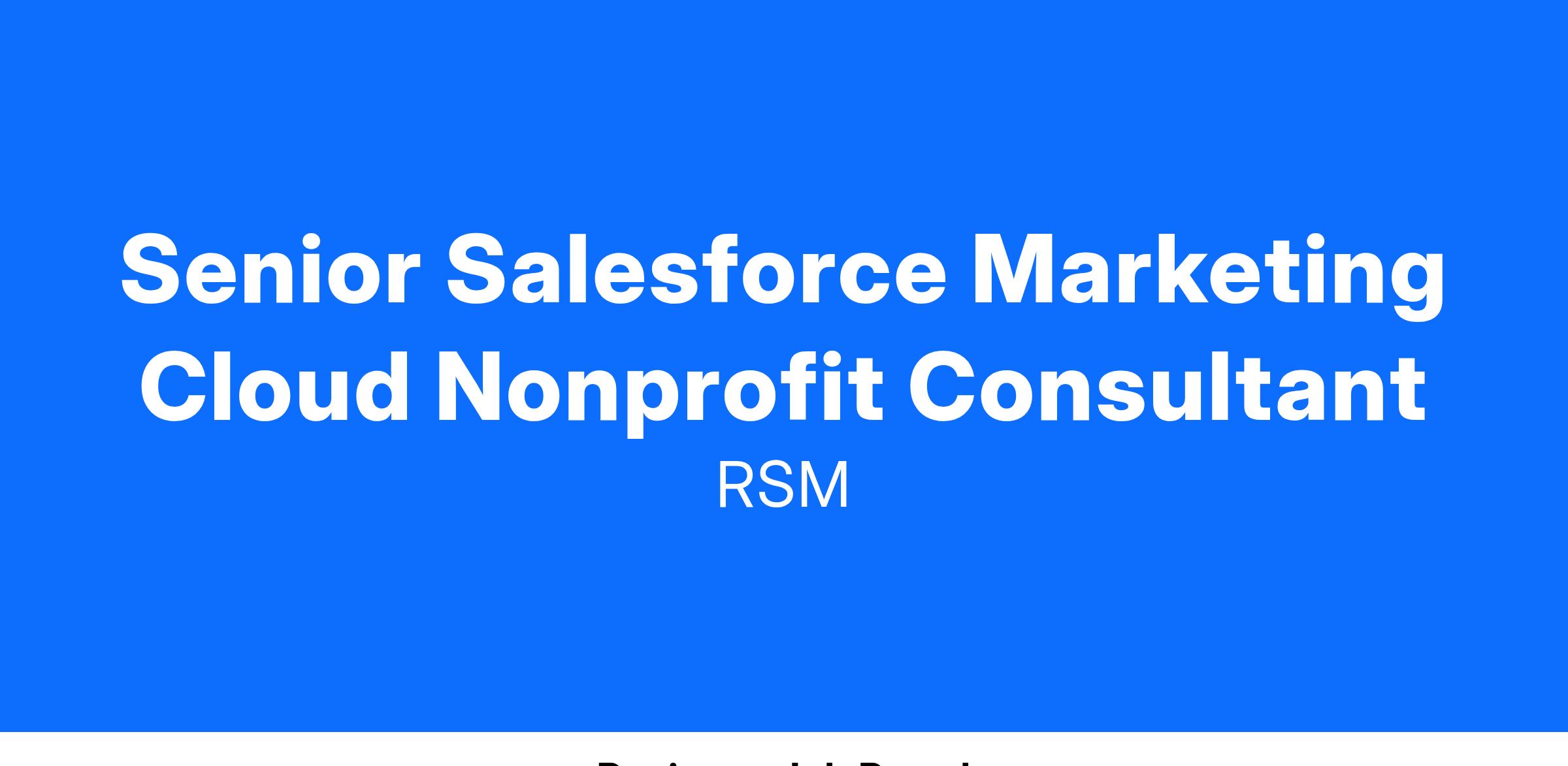 Through a supportive, caring culture, our people are empowered to be their authentic selves, make an impact, own their futures, and achieve their personal and professional aspirations. Together, our people’s individual talents and diverse perspectives strengthen our teams and enhances the unique insights that we provide to our clients. As a member of RSM’s consulting team, you’ll work directly with nonprofit clients to better understand their unique needs and deliver excellent solutions within the Salesforce NPSP and Nonprofit Cloud environments. This experience also allows you to see firsthand the positive impact your efforts have on the client’s success.