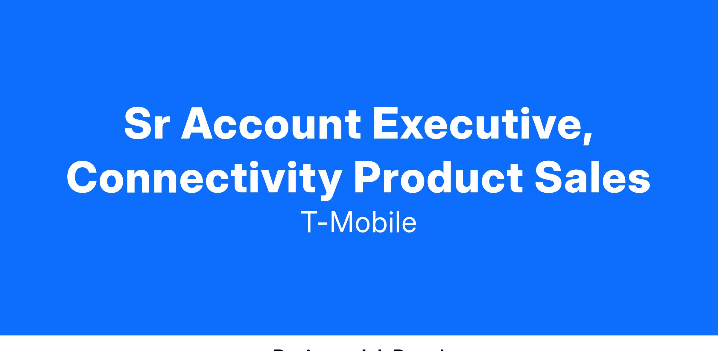The Sr. Account Executive, Connectivity Product Sales is responsible for selling the T-Mobile 5G Advanced Network Solutions portfolio including Hybrid and Private Networks, MEC, Fixed Wireless Solutions, and SD Edge capabilities. This includes support for all field-based segment existing accounts and prospecting new business relationships that will drive connectivity product revenue for T-Mobile. Assigned product lines may evolve as T-Mobile introduces new products. The Sr Account Executive has an extensive understanding of the marketplace, competitive landscape and customer requirements for connectivity products.Job Responsibilities: