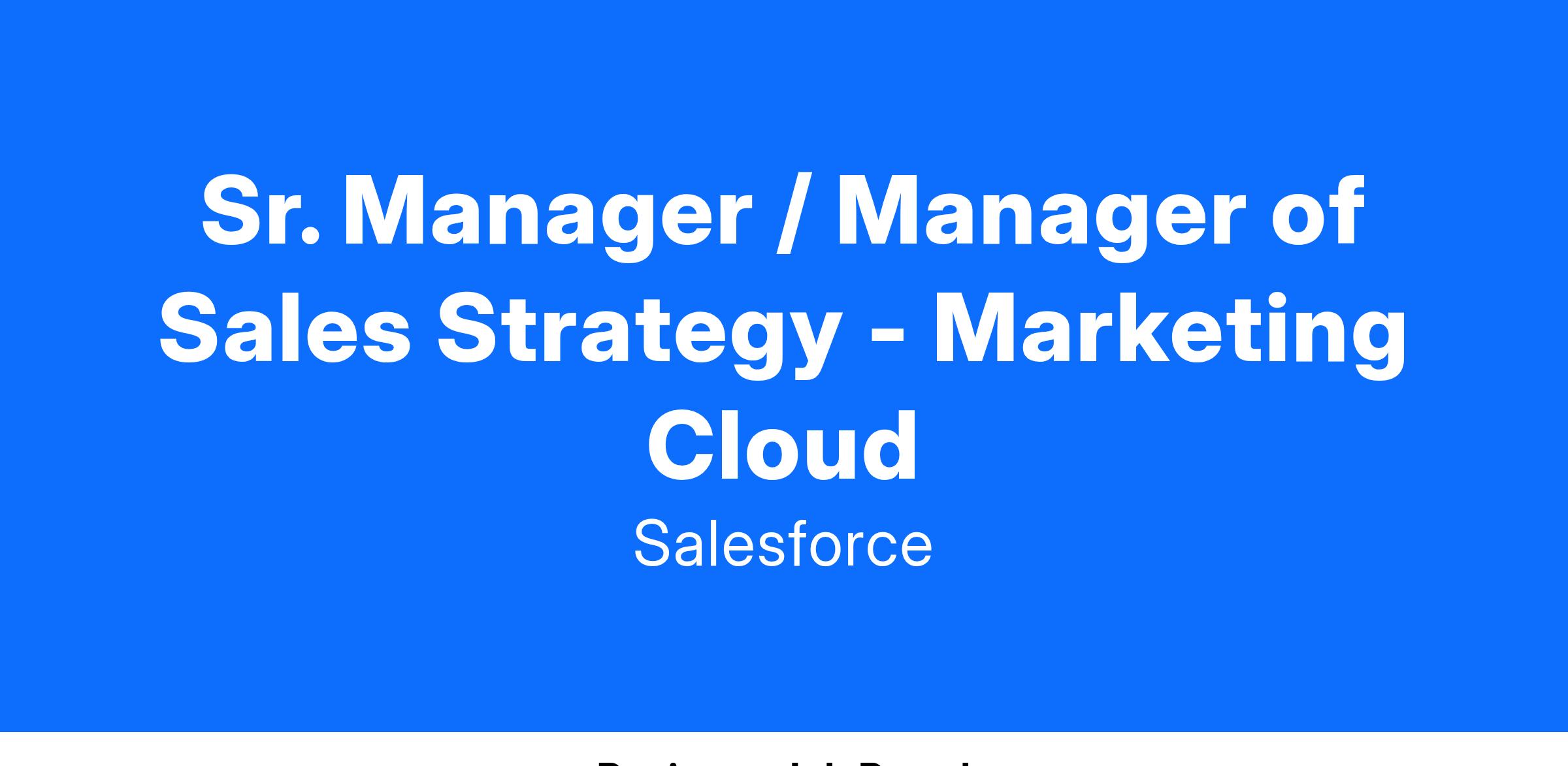 We are seeking a results-driven Sr. Manager / Manager of Go-to-Market (GTM) Strategy to lead the alignment and execution of initiatives driving sustainable Marketing Cloud growth. This role will work with and connect cross-functional teams, prioritize high-impact areas, and ensure lockstep collaboration between product and distribution teams. The ideal candidate will possess a strategic mindset, strong leadership skills, excellent communication skills and a passion for driving measurable business outcomes in a dynamic environment.