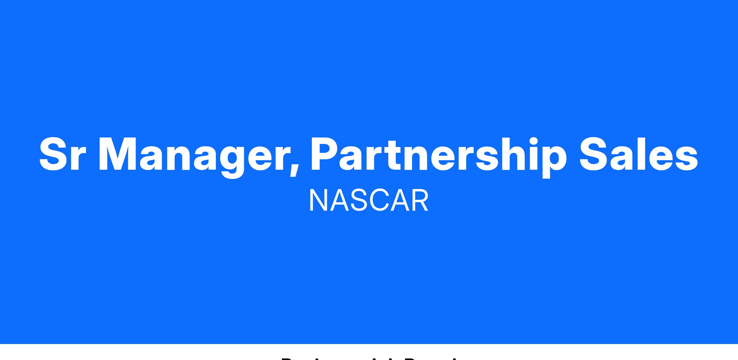 NASCAR is seeking a Senior Manager of Partnership Sales to work from our Charlotte, North Carolina or at Darlington Raceway corporate office. This role will generate revenue through the sale of major marketing partnerships and serve as a trusted representative for one of the most powerful and influential sports organizations in the world.