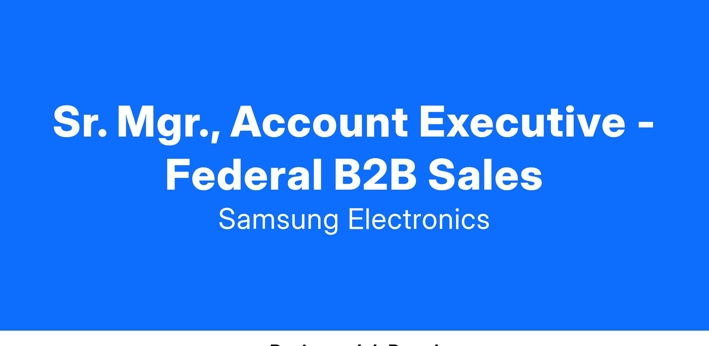 The role will focus on growing new business while maintaining existing accounts and organic business generation. The Sales Account Executive ensures an excellent client experience at all times, and manages the top-level relationship with the client. The role will be key in the development of near-term and long-term solution and GTM strategies, execution of multiple marketing approaches and collaboration on product and technical roadmaps. This role is a technical sales role promoting Samsung’s Federal market strategy and solutions. The Sales Account Executive should be comfortable as a technology expert and viewed as a trusted advisor to the C-Suite.