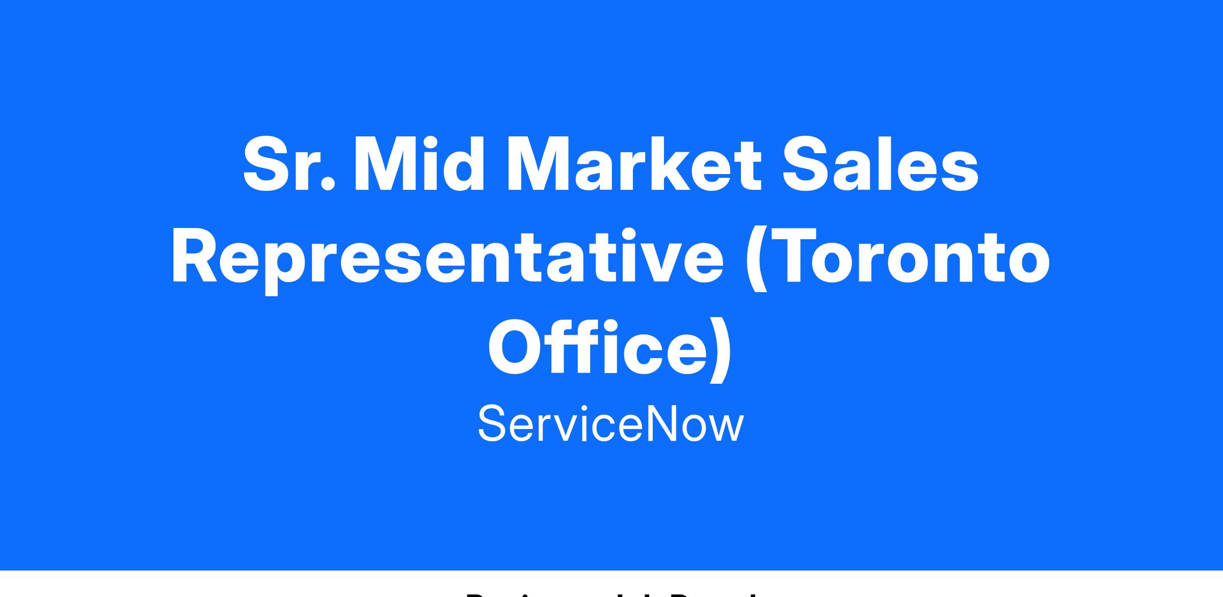 ServiceNow is currently seeking a highly driven Sr. Mid Market Sales Representative to join our expanding Inside Sales team. The Sr. Mid Market Sales Representative will be responsible for strategically prospecting into new accounts, expanding usage within existing customer base, and ensuring these customers continue to get value from the NOW Platform. The candidate will be an individual with a demonstrable track record in new business pipeline generation ideally over the telephone within an Enterprise capacity. They will collaborate with their team of Sales Specialists, Solution Consultants, Renewal Sales and more to exceed quota and build the future of ServiceNow sales talent.