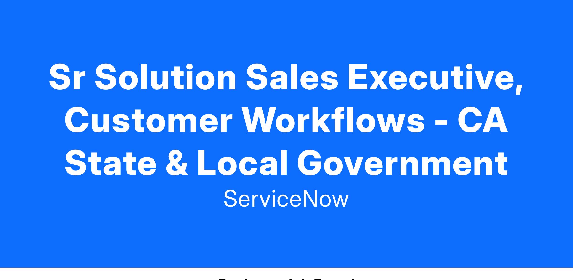 The Customer Workflows Solution Sales Executive will oversee State and Local Government market success of ServiceNow's CX, FSM, Source to Pay and related Customer Workflows solutions to California State & Local Government (SLG) clients. These products are built on our market leading Service Management platform and create a single source of truth that allows enterprise processes to execute with uniform information.