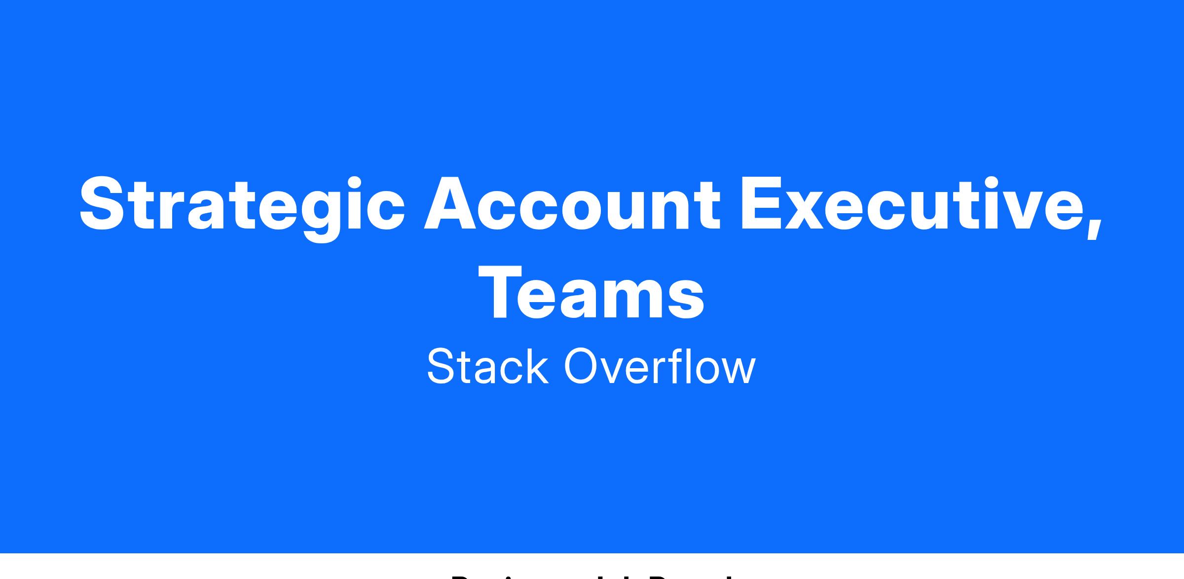 We are seeking a talented, driven sales hunter to find and close new business across key Strategic accounts (10,000+ employees) supporting our Stack Overflow for Teams solution. Stack Overflow for Teams is the homebase for mission-critical knowledge sharing and collaboration, enabling our customers to find the information they need to stay on track, meet launch deadlines, and drive innovation.