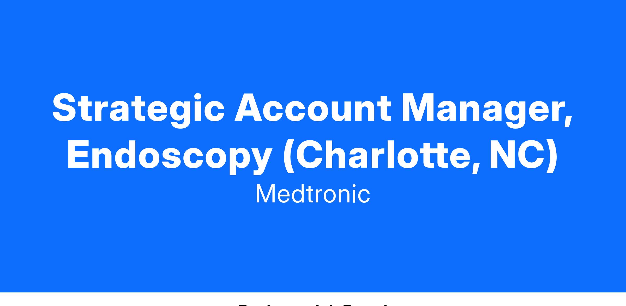 The Strategic Account Manager (SAM) is a field-based Medtronic Gastrointestinal sales position. This individual will call on healthcare organizations, primarily hospitals, in a defined geographic area. The SAM will serve as a customer facing product expert primarily responsible educating physicians and nurses on the clinical advantages of the entire GI product portfolio. The position is focused on expanding the utilization of GI products through market development and sales-oriented activities. Additionally, the SAM is required to continually develop their clinical knowledge to serve as a product expert for the company. By doing so, they can convey information in an effective manner to help support optimal utilization of the full product portfolio to the widest range of health care providers.