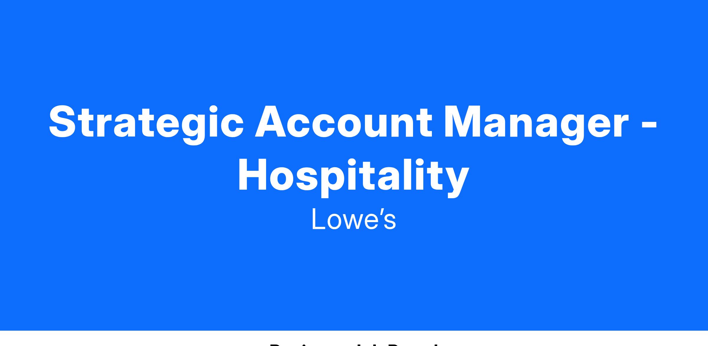 The Strategic Account Manager – hospitality sales is responsible for maintaining and expanding relationships with strategically important large customers across all focus segments of Lowe's. This person must build and maintain long-term, mutually beneficial partnerships with key personnel in assigned strategic accounts. S/he will be the main point of contact for all national account matters and is required to understand the account's needs and collaborate with other internal functions to ensure that accounts succeed in achieving their business objectives. This person is also expected to bring in new business from existing national accounts by cross selling and/or upselling products/service offerings as well as bring new customers to the Lowe's organization.