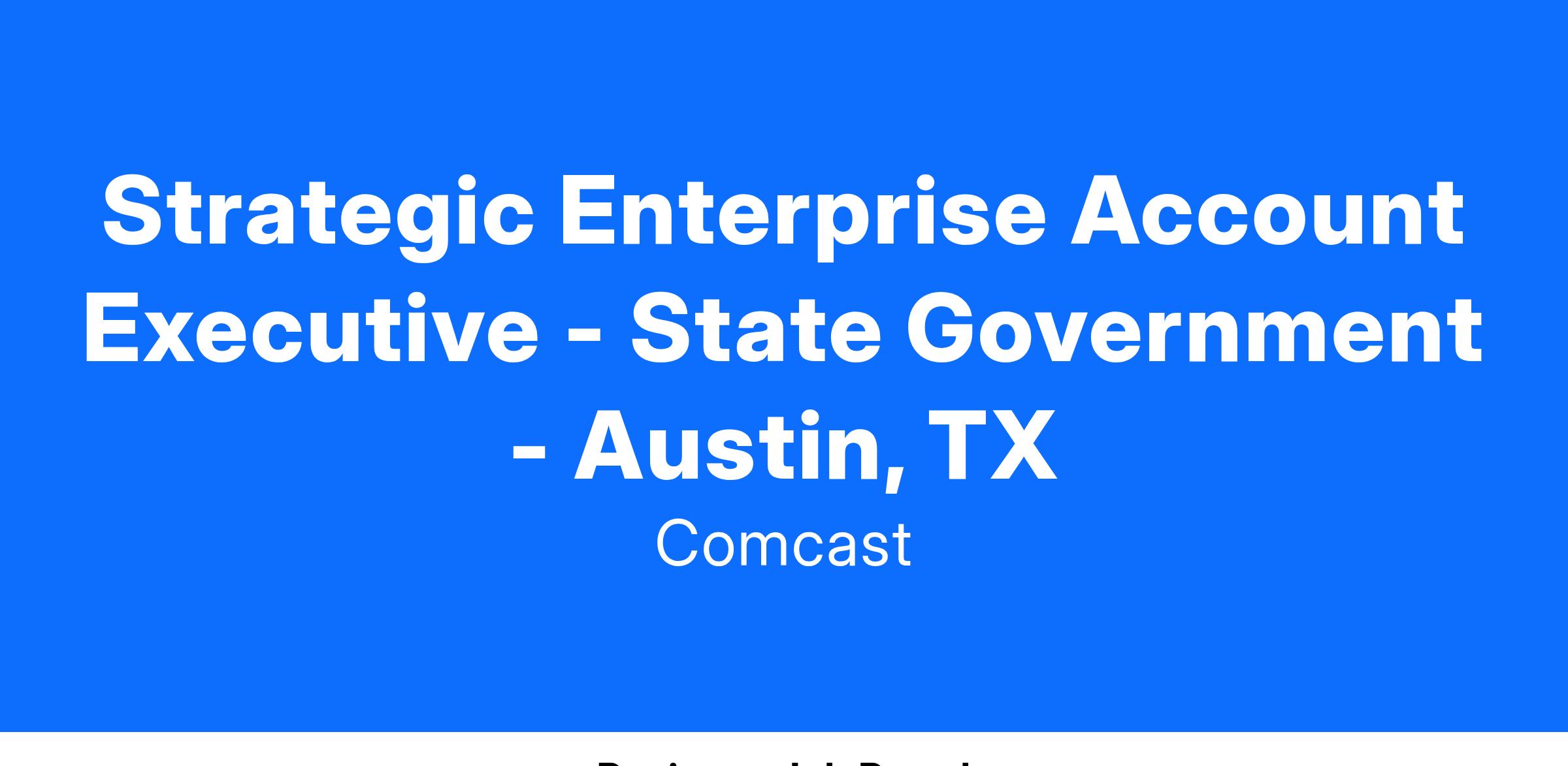 Responsible for the sales strategy of Comcast High Capacity Ethernet Networks, Internet, Video and Voice-based services to State Government entities in Texas. Works as part of a team to drive sales by focusing on acquisition, development and management of strategic prospective clients in designated territories. Designs and delivers live sales presentations to prospective strategic clients, develops relationships with clients and the community and positions the Comcast brand as key components of the sales strategy, in keeping with Comcast's touchstones. Has in-depth experience, knowledge and skills in own discipline. Usually determines own work priorities. Acts as a resource for colleagues with less experience.