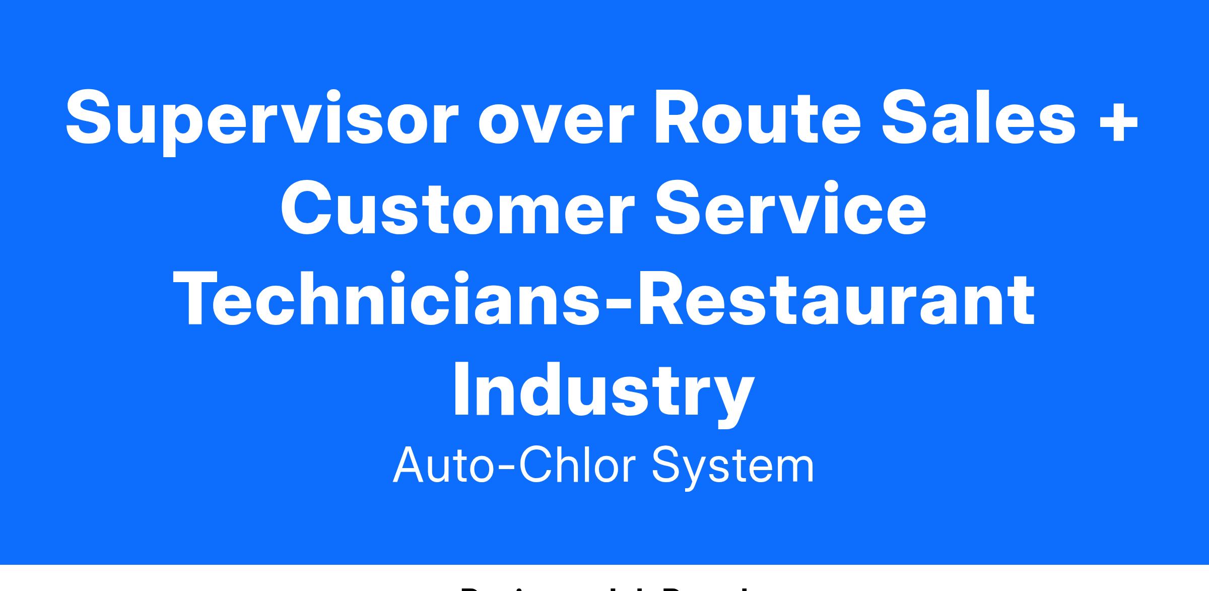 As a Supervisor, your mission will be to lead your team to provide High Quality Service to 800+ restaurants in Atlanta. Training & development of your employees is a priority. Growth and improvement of your department Is measurable, so you need to be competitive, organized, and goal oriented. This role requires one to wear a lot of hats. Daily activities include Supervising, Leadership, Riding Along with employees, Customer Service, Equipment Maintenance and Repair, Inventory Control, Delivery, Invoicing, AR, Professional Driving, Safety, Sales/Upselling and more. To be successful, you need to have good people skills, be highly motivated to succeed and enjoy learning. We provide you side by side training in the field, and in the class room. The learning and improvement is continuous.