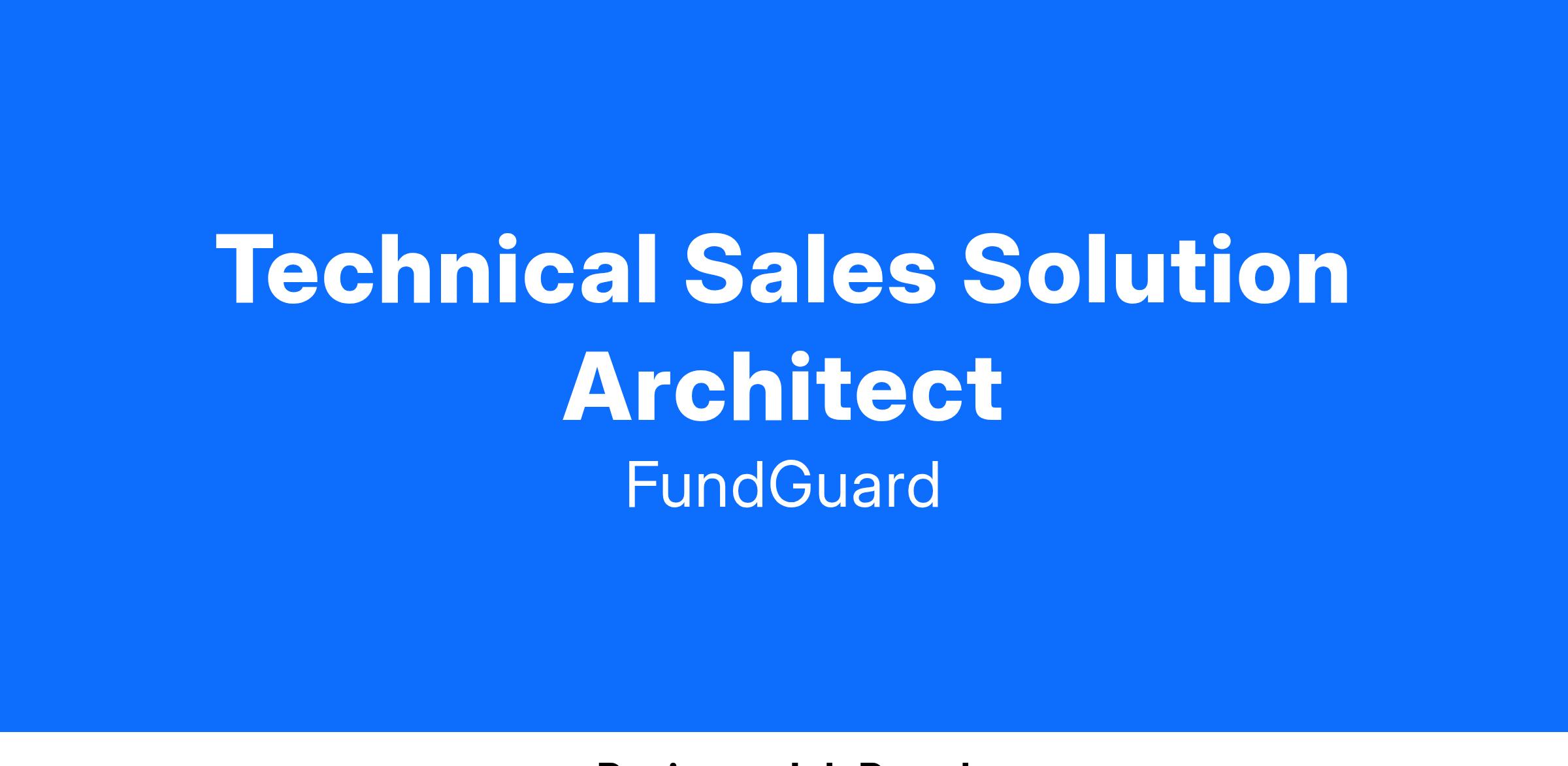 FundGuard is an international organization that recently established its US presence in Boston. We are currently hiring a Technical Sales Solution Architect to support our growing team through the support of our sales and R&D group. In this role you will use your customer service and technical knowledge to provide advice and support to internal and external clients on FundGuard products. This role is responsible for supporting the sale of the company's products and services by assisting with the development of overall company and product strategy, while demonstrating strong technical knowledge and understanding of our products.