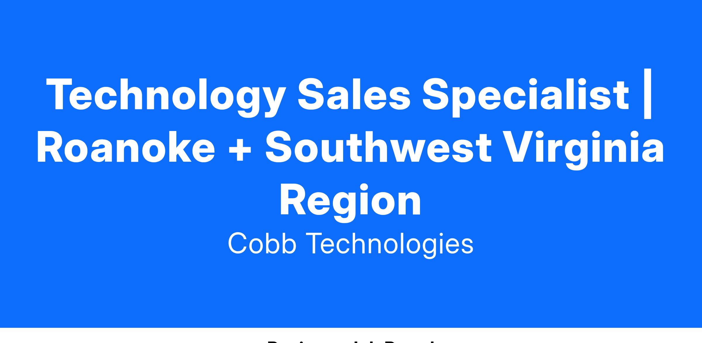 Cobb Technologies has a full-time, entry-level, outside sales position for motivated individuals to secure solutions-based sales technology opportunities in our Roanoke & Southwest Virginia territory, which include Blacksburg VA, Christiansburg VA, and New River Valley! We are looking for candidates who are interested in learning the outside sales process, managing a client base, and gaining the skills to bring on new clients! If you enjoy meeting new people and presenting ideas and solutions, then let's talk!