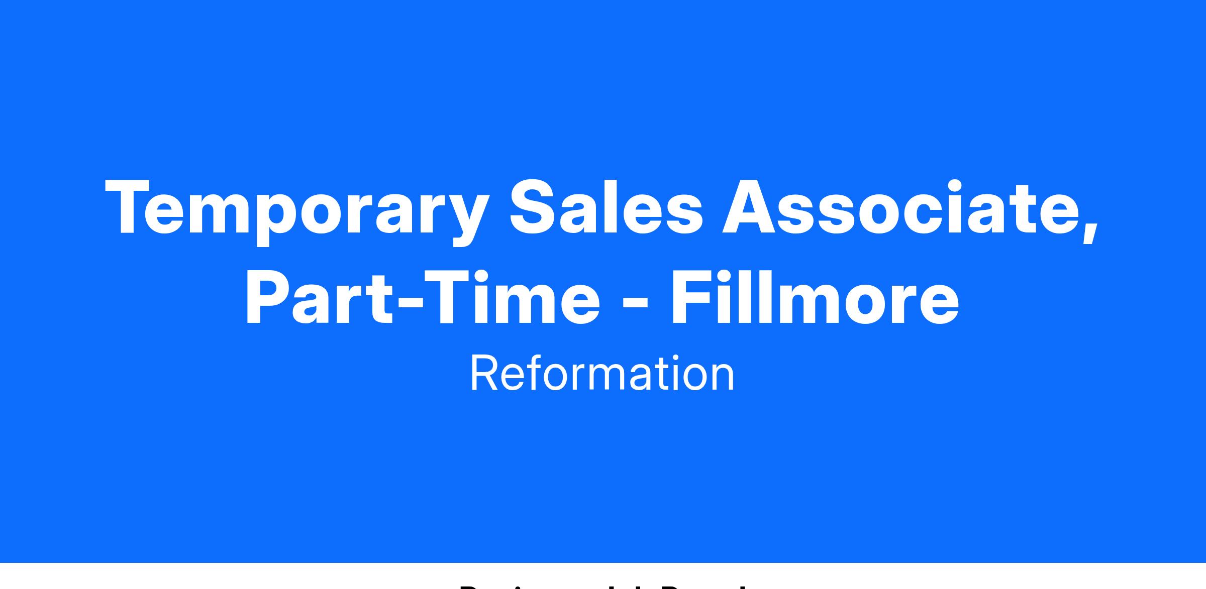 No position at Reformation is about the status quo, every team member is passionate about building a company rooted in excellence. Obsessed with customers and sustainability we use tech to create a unique interaction between our customers, employees, and the Reformation brand. The Associate will execute all efforts required to achieve individual sales goals.
