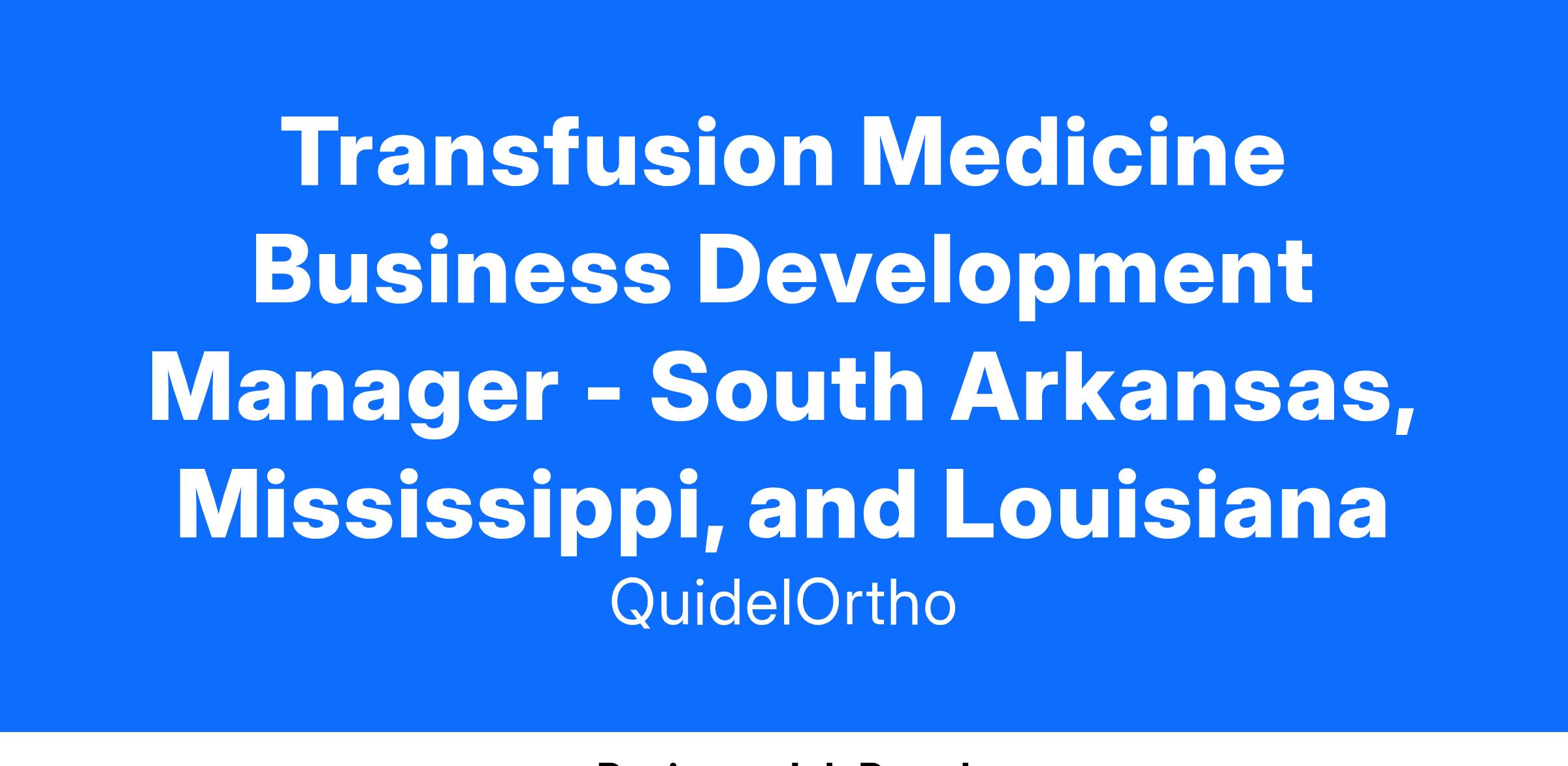 As we continue to grow as QuidelOrtho, we are seeking a Transfusion Medicine Business Development Manager in the Gulf Region. This position is a front-line quota-carrying teammate responsible for the sale of Transfusion Medicine product lines to customers within a geographic territory. The position is responsible for acquisition, conversion, implementation, and adoption of competitive Transfusion Medicine accounts. Additionally focuses on retention of high value strategic current customers by teaming with Account Managers, Technical Specialists and Strategic Account Executives as applicable. This is a field based position covering the Gulf Region including the South Arkansas, Mississippi, and Louisiana.
