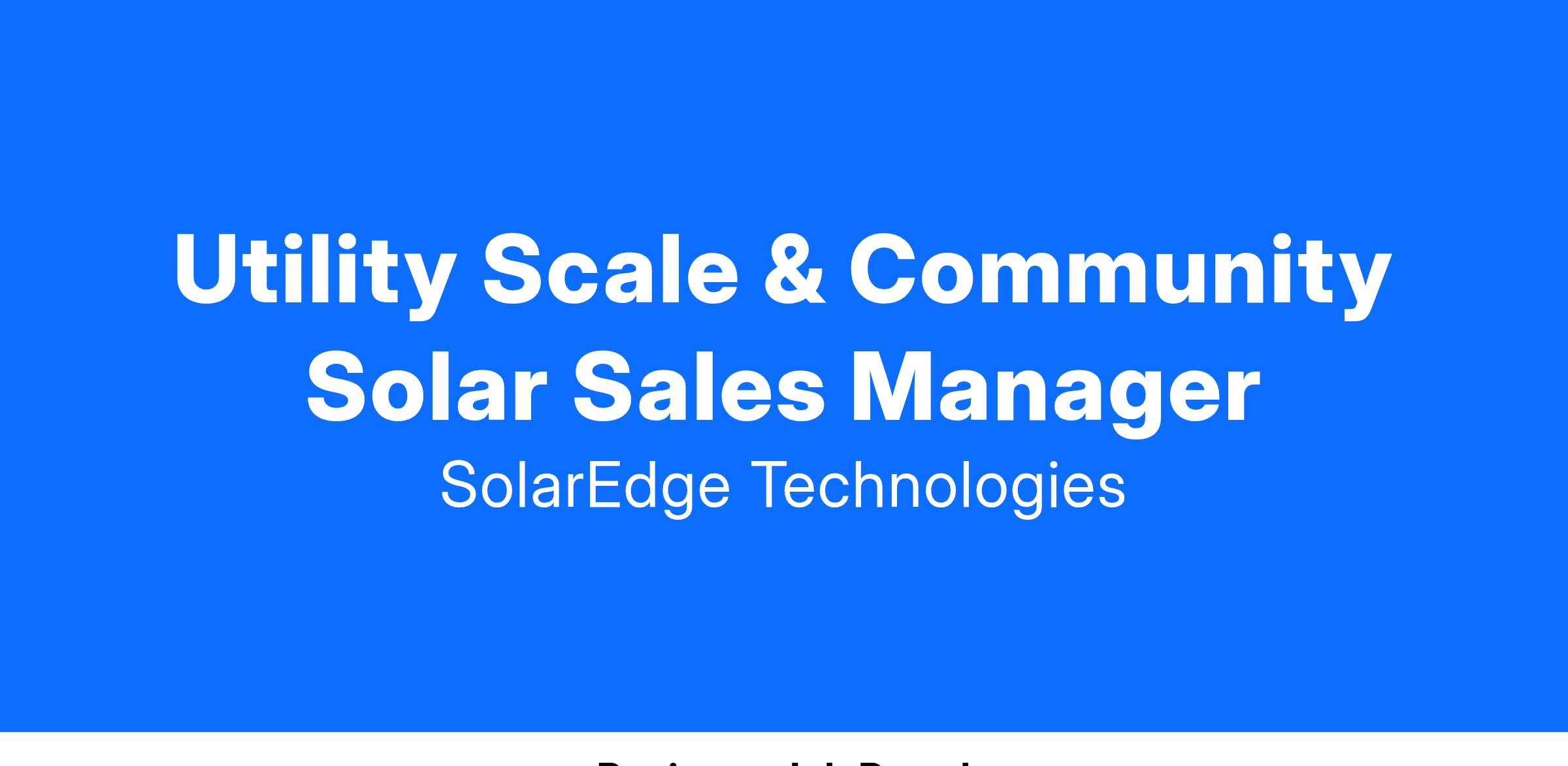 SolarEdge (NASDAQ: SEDG), is a global leader in high-performance smart energy technology, with over 5000 employees, offices in 34 countries, and millions of products installed in over 133 countries. Our diverse product offering comprises intelligent solar inverters, battery storage, backup systems, EV charging, and complete home energy management ecosystems. By leveraging world-class engineering capabilities and with a relentless focus on innovation, we strive to create a world where clean, green energy from the sun is the primary source of power for our homes, businesses, and just about everywhere we thrive. This position provides the successful candidate with the opportunity to join SolarEdge’s North American Sales Team and have a major part in leading the company’s sales efforts in the Utility scale and Community Solar segment of the solar industry.